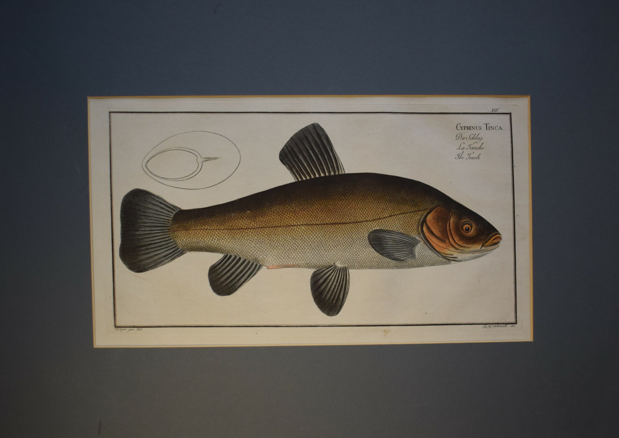 Handcoloured copper engraving from Marcus Elieser Bloch’s work ”Natural History of Fishes of Germany”. Plate designed by Krüger, engraved by J. G. Schmidt. Original 18th century fish print in passepartout.
