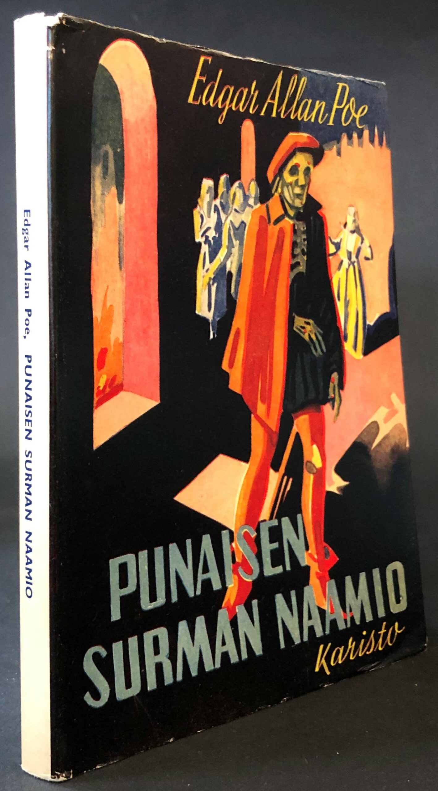 The Mask of the Red Death. Published by Karisto in 1954. Second Finnish language edition. Good antiquarian condition. Cover slightly worn on the edges, a small burn hole on the front. Internally clean, some handwritten marks.