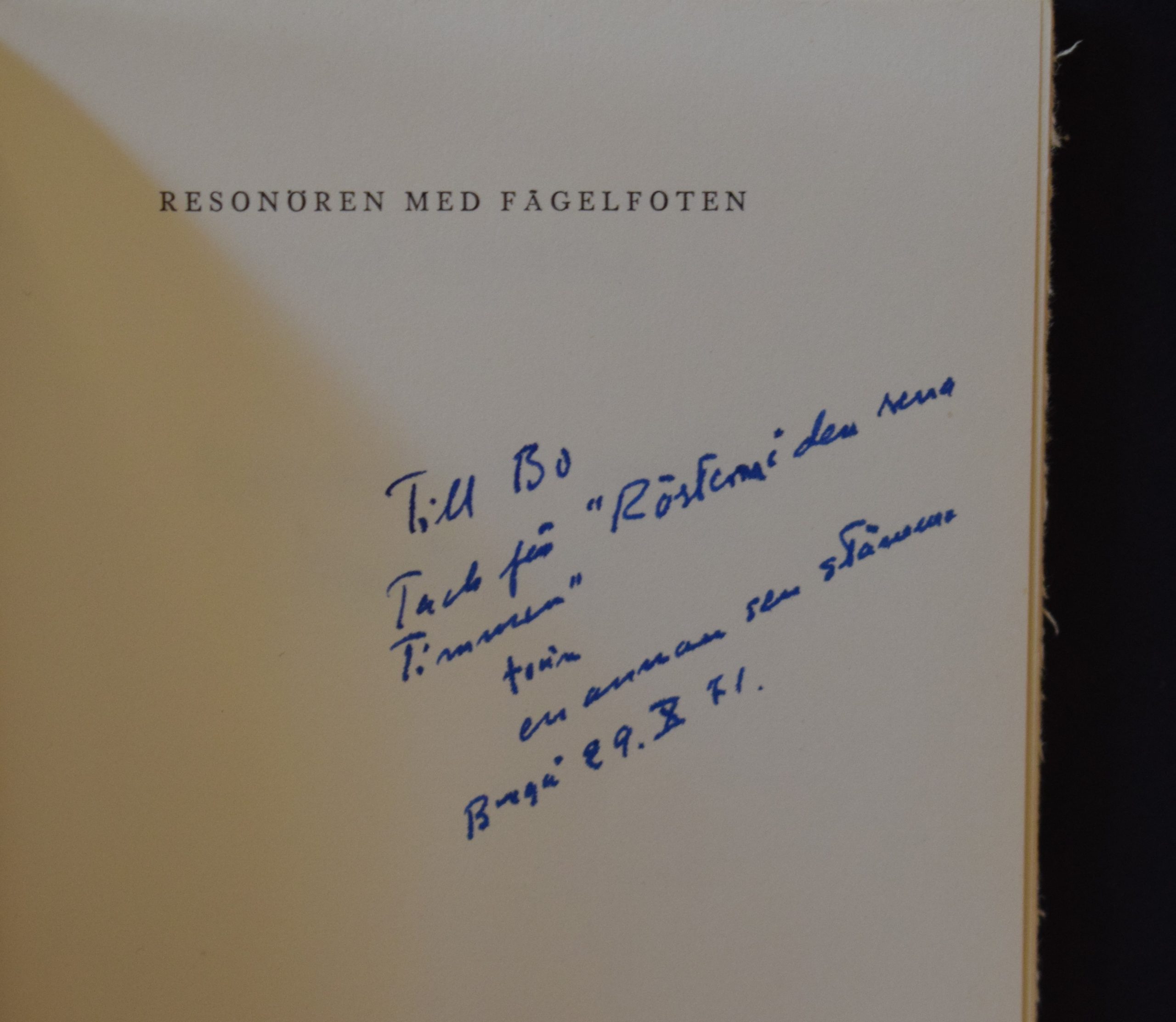 Med författarens dedikation till Bo Carpelan